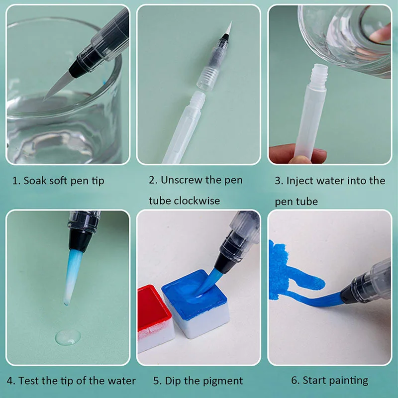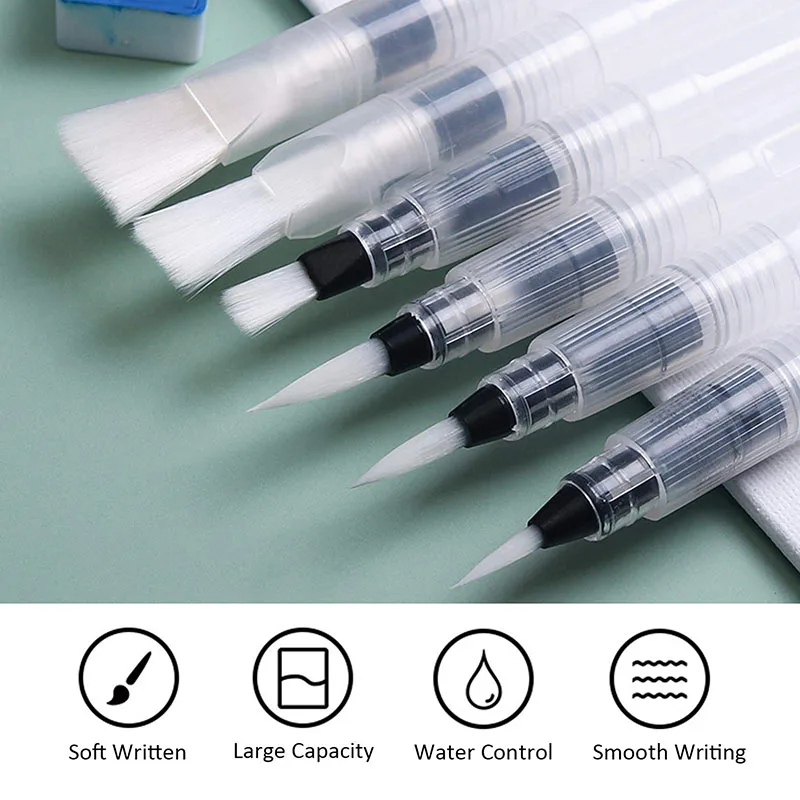 6pcs Watercolor Brush Pens, Refillable Water Brush Perfect for Artists & Calligraphy, Travel-Friendly, Easy to Clean & Use